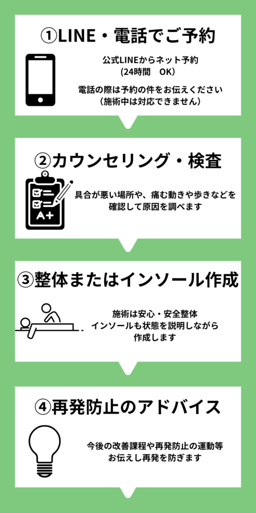 ※整体60分の場合、カウンセリング・施術・動作確認・アフターフォロー含め60分となります。インソール作成の場合は整体は含まれません。