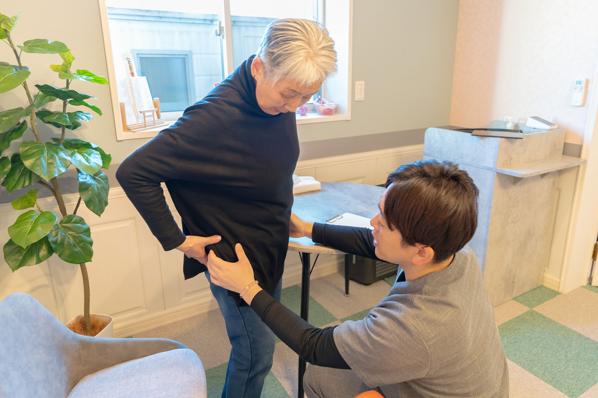 問題点は皆異なるを前提として痛みの動作・強さ生活動作の問題等確認の上、施術に入ります
